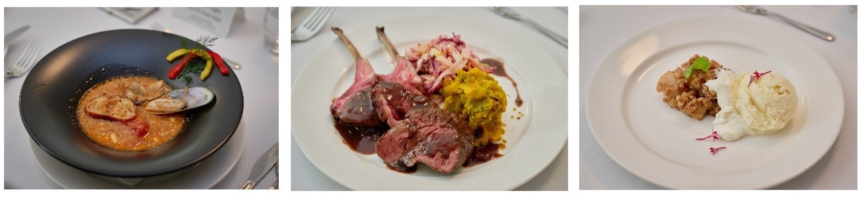 左から、<前菜>ムール貝とダイヤモンドシェルクラムのクリームチーズトマトスープ 焼きたてパンとバターを添えて <メインのお肉料理>かぼちゃとリンゴのコールスローサラダ グラスフェッド ラムラックのカツレツ グラスフェッドビーフのソテー スモーク風味 <デザート>アップルクランブル レモンチーズケーキ味アイスクリーム添え