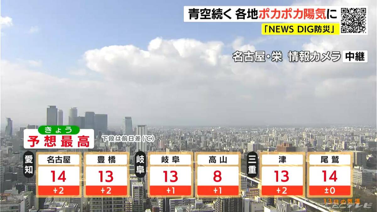 週末は各地で3月中旬〜下旬並みの暖かさに きょうの予想最高気温は名古屋14℃ 岐阜・津などで13℃ 愛知・岐阜・三重の天気予報(2/13 昼)