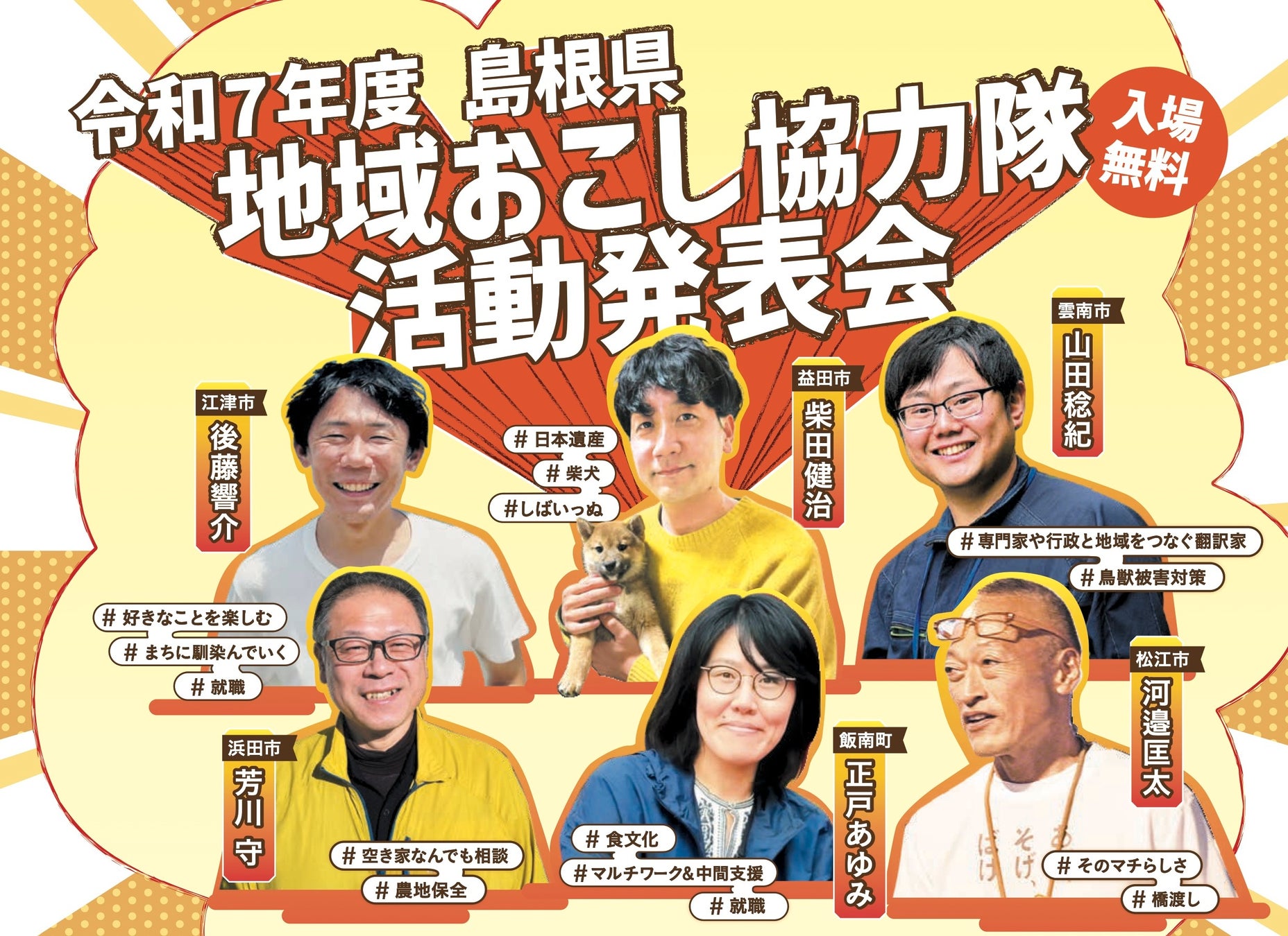 島根県内各地で地域づくりのために様々な活動をする地域おこし協力隊。今回は、松江市、浜田市、江津市、益田市、雲南市、飯南町6つの自治体の活動最終年の隊員たちのこれまでの活動とこれからの展望を発表します。観光、食文化、空き家、鳥獣害対策、体験開発、しば犬など各隊員が取り組んだ多彩な活動やその試行錯誤のプロセスを知る貴重な機会です。現地もしくはYouTubeライブ(アーカイブあり)でご覧いただけますので、ぜひご覧ください。