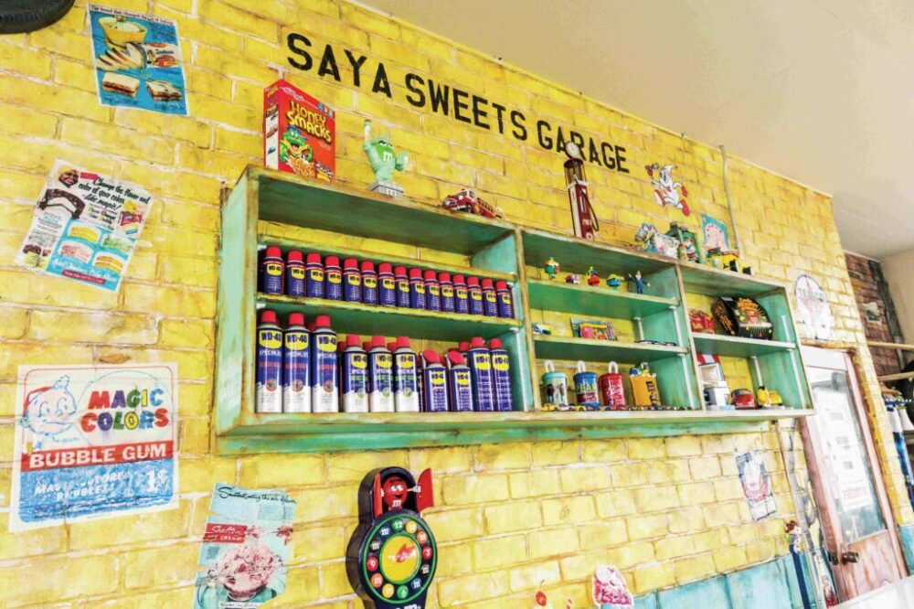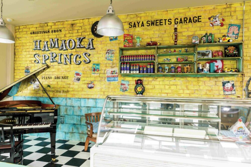 セールスルームはポップなカラーでペイントされたレンガ壁となっている。これはカントリーベースのデザインコンクリートで造作したもの。手前の冷蔵ショーケースは、休日にスイーツなどを販売するために設置したもの。