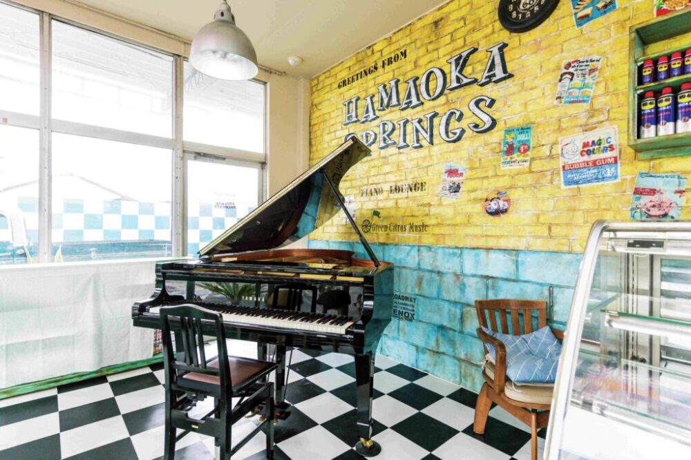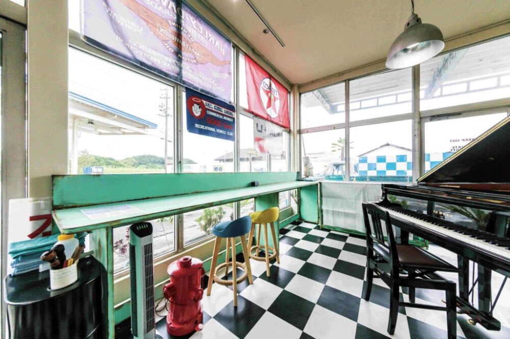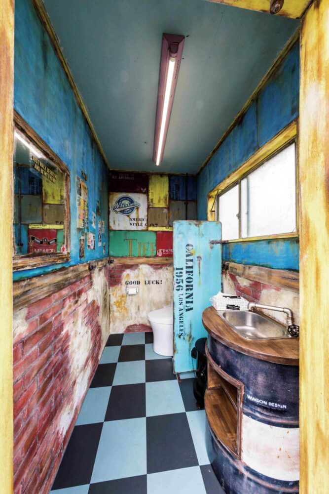 セールスルーム内は「カントリーベース」のデザインコンクリートによる造形で、レンガ調の壁面に。さらにグランドピアノを設置してポップな空間となった。建物の側面に回れば、トイレも見所いっぱい。エイジング加工した扉や内部の壁面は、まるで旧いアメリカのガスステーションのよう。
