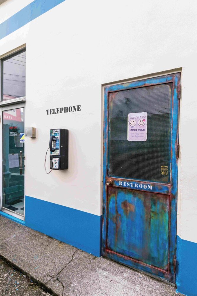 建物側面にあるトイレは、デザインコンクリートによる造形とエイジング加工でまるでタイムスリップしたかのような空間に。扉の脇には古いアメリカの電話も設置され、雰囲気満点!