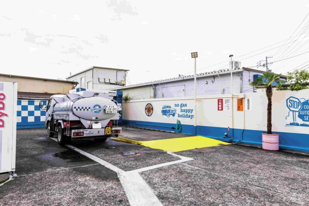 敷地内には門型の洗車機も完備している。また自社で所有しているタンクローリーも敷地と同じ模様でリペイントされている。