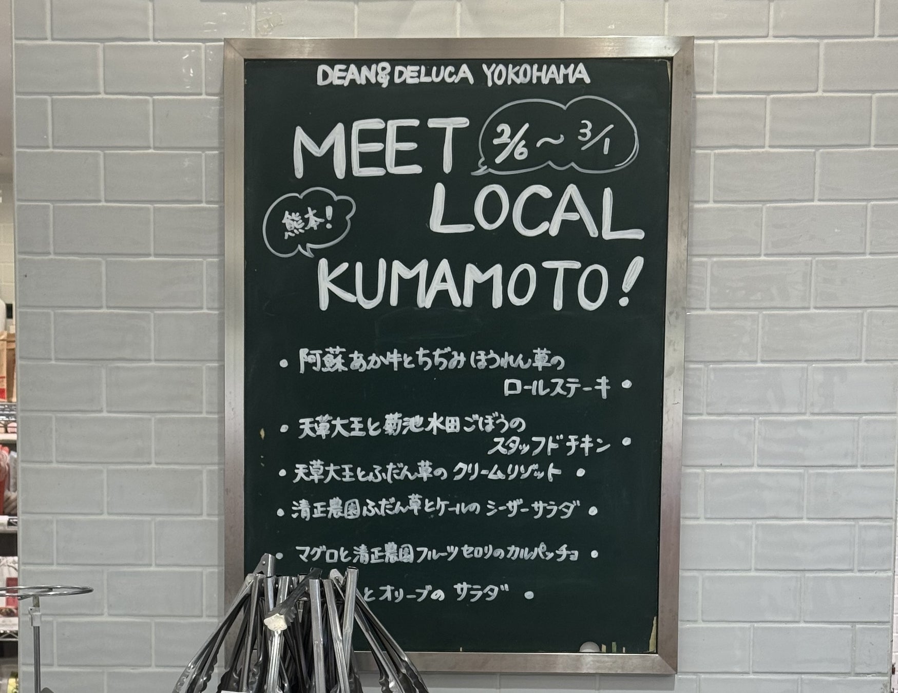 熊本県農林水産部食のみやこ推進局 流通アグリビジネス課は、特徴ある県産農林水産物等の首都圏での認知度向上の一環として、DEAN & DELUCA 横浜店および恵比寿店にて熊本県産食材を主役にした限定イベント「MEET LOCAL」を3月1日(日)まで開催しております。DEAN & DELUCAのシェフとバイヤーが2025年11月に熊本の産地を巡り、現地で出会った食材と生産者の想いを、惣菜・デリの限定メニューとして展開していただきました。食のみやこ熊本の魅力を“五感で体感できる”特別企画です。近くにお越しの際は是非ともお立ち寄りください。