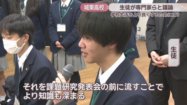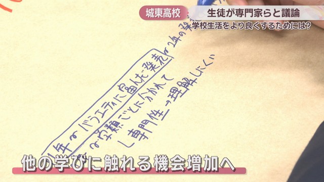 グループの一つは、理数学類や音楽学類などさまざまなコースがある城東高校で、生徒が他のコースの学びに触れる機会を増やすにはどうしたらいいか、外部の専門家らと議論し、発表しました。