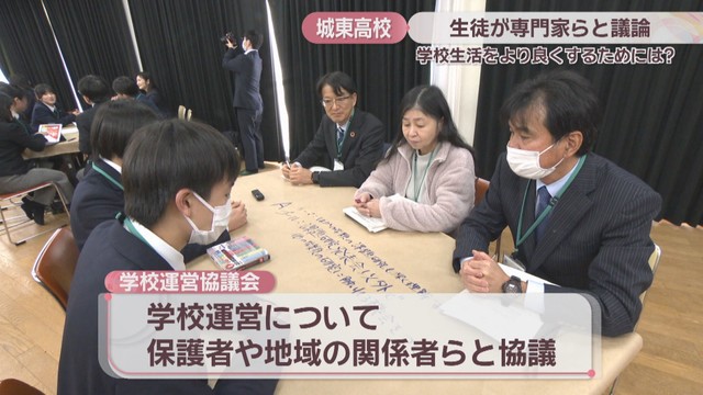 2月13日に岡山市中区の城東高校で行われた「学校運営協議会」です。学校の運営について学校長らが保護者、地域の関係者らと協議する場ですが、城東高校では生徒の視点を取り入れようと、1、2年生15人が参加しました。