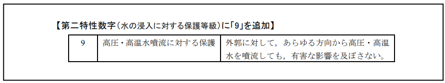 日本規格協会(JSA)は、電気機械器具の防水・防塵性能を表す「IPコード」における、水の浸入に対する保護等級で、従来の「8」を超える「9」を導入した。