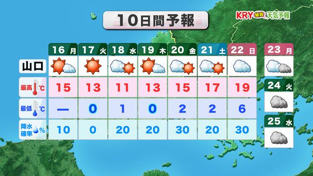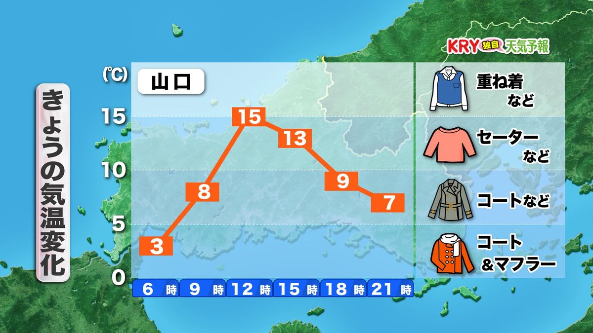 内陸や瀬戸内側では日ざしが良く届き、山口市内では最高気温が15度まで上がる予想です。