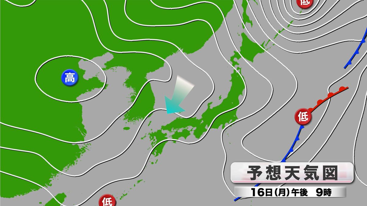 きょう16日(月)の日本付近は西高東低 冬型の気圧配置。等圧線の間隔が広く、比較的弱い冬型ですが、県内には湿った北風が流れ込みやすくなります。この北風の影響で、きょう16日(月)は日本海側ほど雲の量が多くなる予想です。