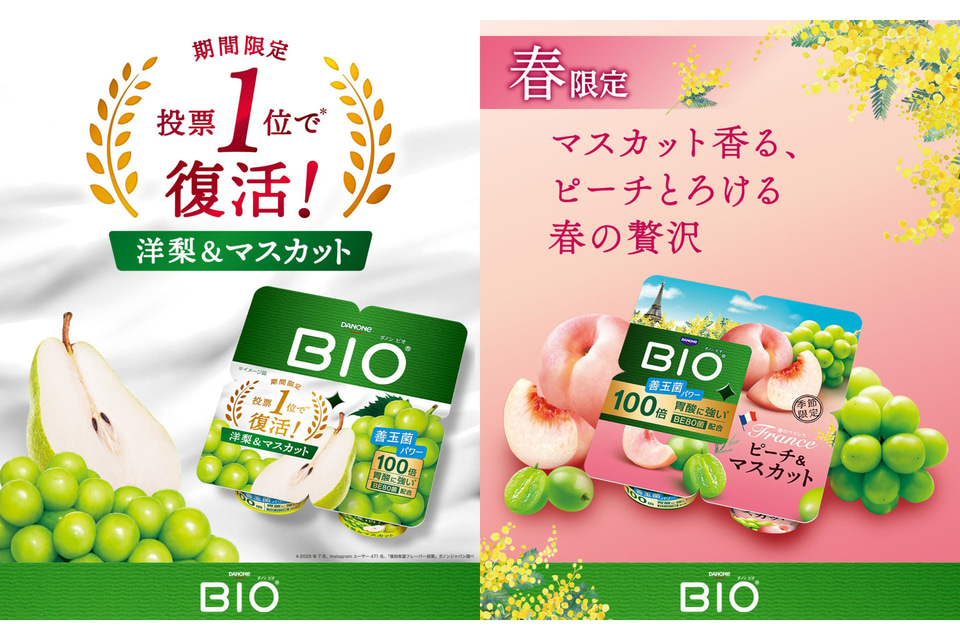 ダノンジャパンは、BE80菌を配合した「ダノン ビオ」ブランドから、“春のフランス”をテーマにした季節限定品「ピーチ&マスカット」と復活投票で1位を獲得した「洋梨&マスカット」を2月16日に発売した。いずれも内容量は300g(75g×4カップ)。