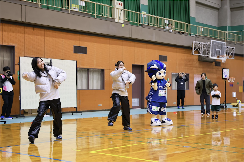身長2mを超える選手や、テレビで見るスター選手たちの登場に、子どもたちの目は釘付けになりました。プログラムは長崎ヴェルカのパフォーマンスユニット「VELC」による「リズムダンス」からスタートし、選手が鬼役となる「鬼ごっこ」、ボールを使った「ドリブルリレー」「シュート体験」へと展開しました。