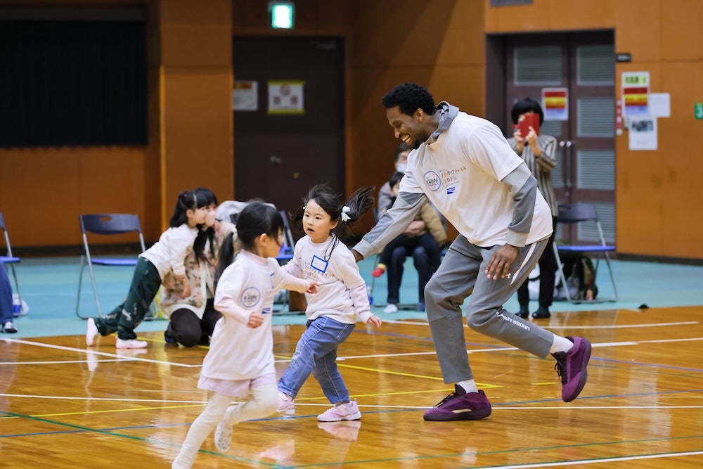 特にシュート体験では、選手から「リングをよく見て投げてみて」と直接アドバイスをもらい、ゴールが決まると満面の笑みでハイタッチを交わすシーンが多く見られました。子どもたちからは「みんなと一緒にできて楽しかった」といった声が聞かれました。また、ドリブルリレーやシュート体験では子どもたち同士での応援や、周りの子の手助けをするなど社会性が育まれるきっかけともなりました。岡田侑大選手(島根)は「バスケットボールに限らず、チャレンジすることが大事。臆することなく挑戦してほしい」と子どもたちへエールを送りました。