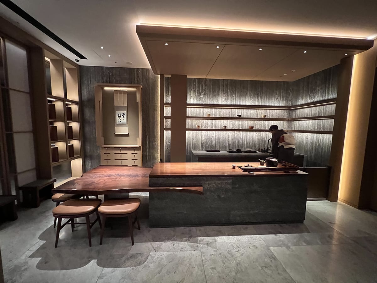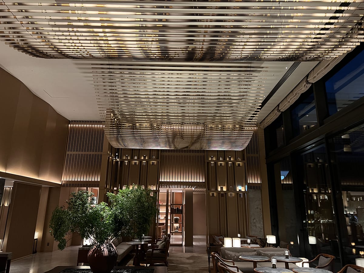 すっかり満たされてプライベート温泉のあるスパエリア「サーマルスプリングSPA」を出て、THE MITSUI館内をそぞろ歩く。ラウンジの天井から吊り下げられたパイプアートも、床から天井まである巨大な窓越しに見える回遊式の中庭やホテルの建物も、すべてがライトアップされて、ただただ美しい。