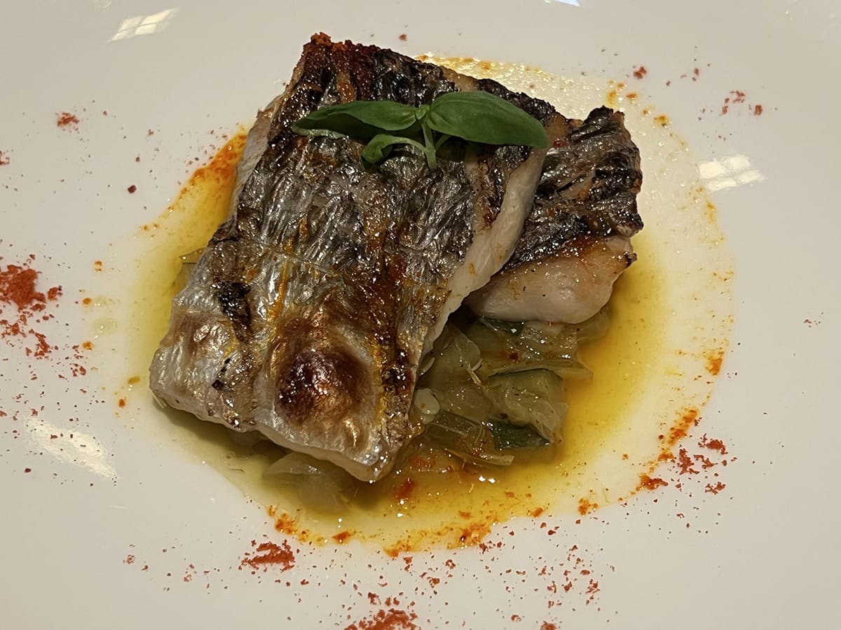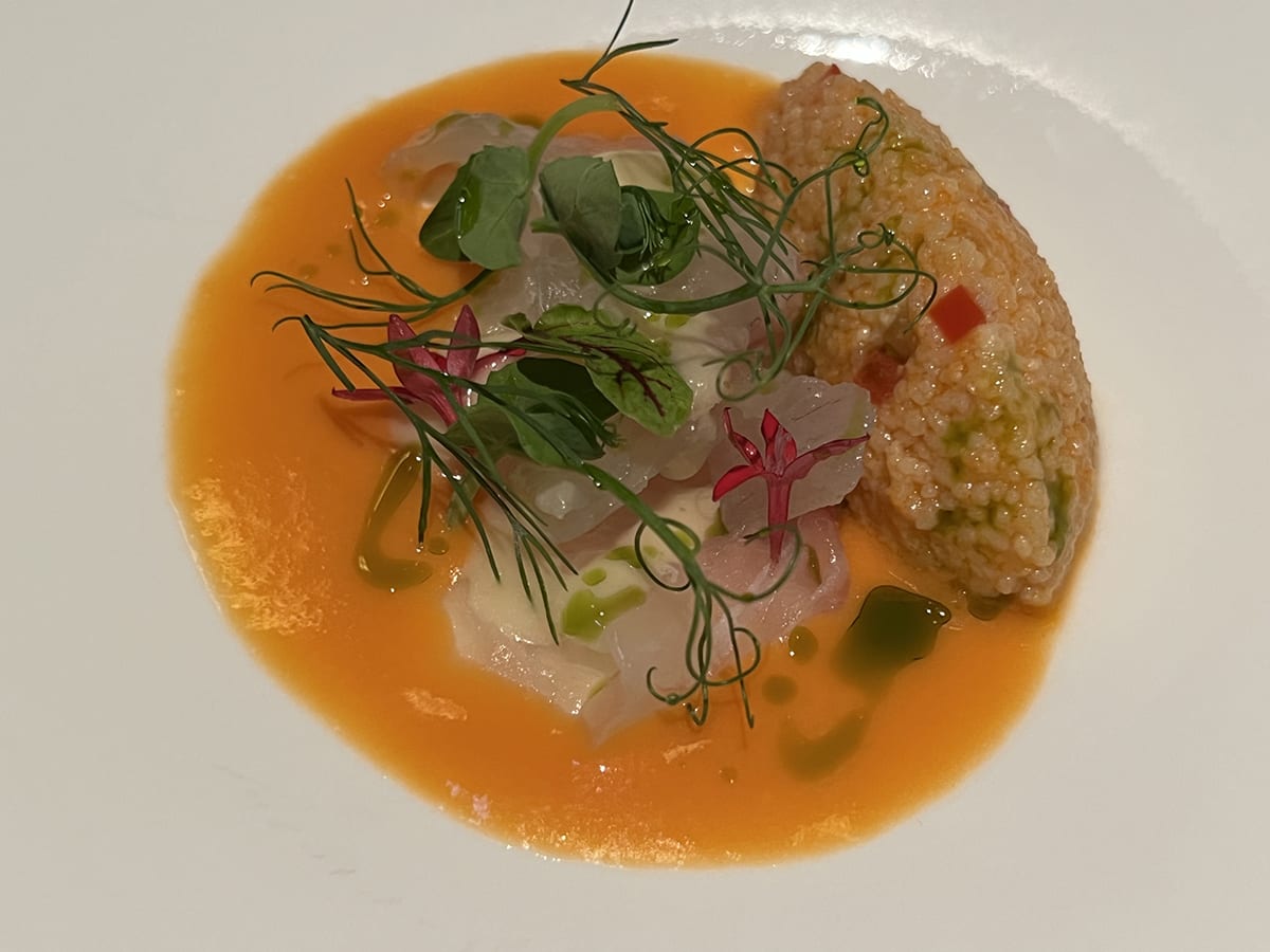 この日(メニューは時期により替わる)、まず出てきたのは、スープ「ズッキーニのポタージュ ミントとスパイス」。どうですか、この美しさ! 舌が焼けるほどアツアツだけれど、夢中で飲み干しちゃうくらいおいしい! ミントやスパイスの香りは効果的だが、きわめて上品でズッキーニのフレーバーをジャマしない。そして、そのあとの料理でも、うるわしい見た目と極上の味に驚かされることになる。