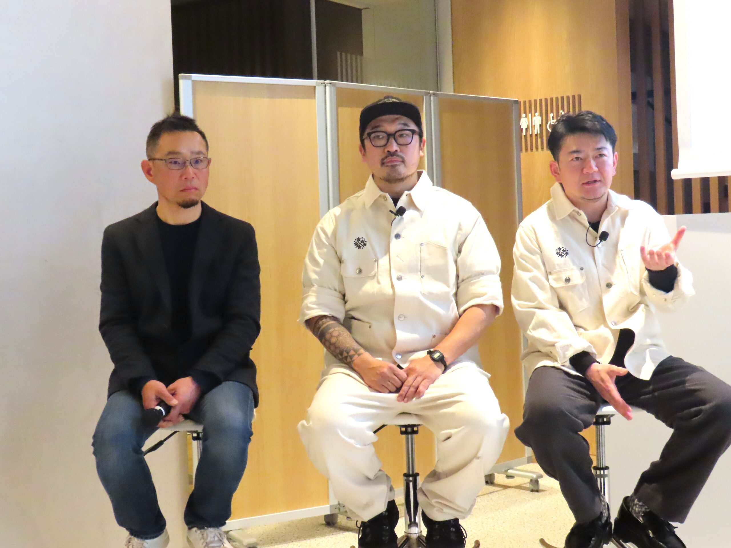 &Bugrass 北総農産の吉岡和彦氏(左)、「テンキ」の料理人・亀谷剛氏(中央)と代表取締役・目良慶太氏(右)