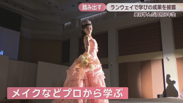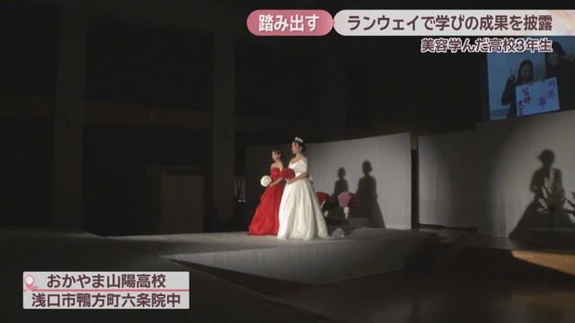 美容などを3年間学んだ岡山県浅口市の高校生が17日、卒業イベントでウェディングに合わせたメイクやヘアセットなどを披露しました。