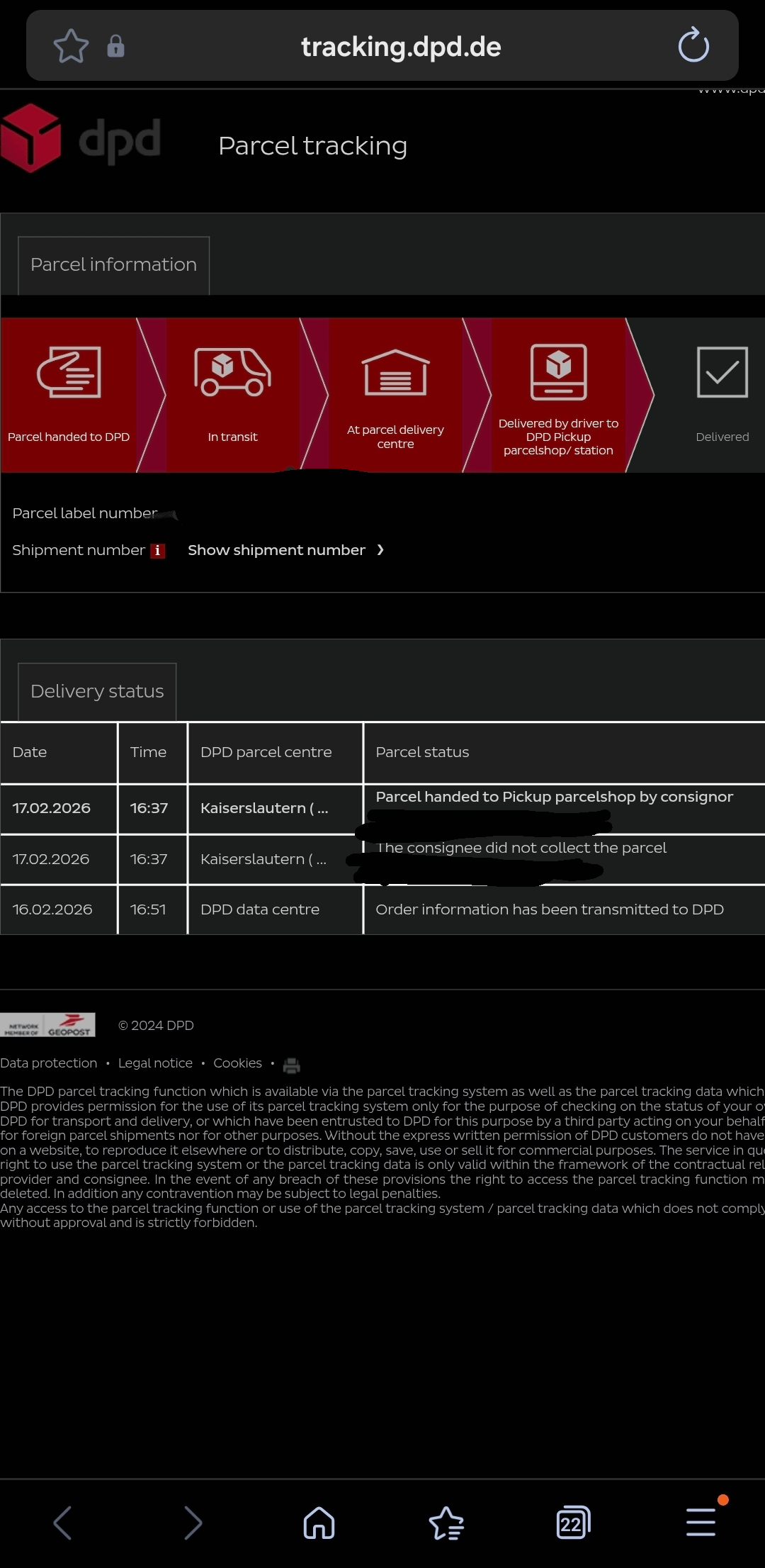 こんにちは!文脈として、私はvinted経由でパッケージを発送し、購入者はDPDショップからショップを選択しました。これで問題が発生したことはありませんでしたが、配達の受け取り期間が延長されたことが表示されます。しかし、私はそれを渡したところです。これは彼らの既知の問題ですか、それとも、特にまだ転送されていないことは間違いなく、情報が混乱しているだけなので、何か問題が発生しましたか Germany