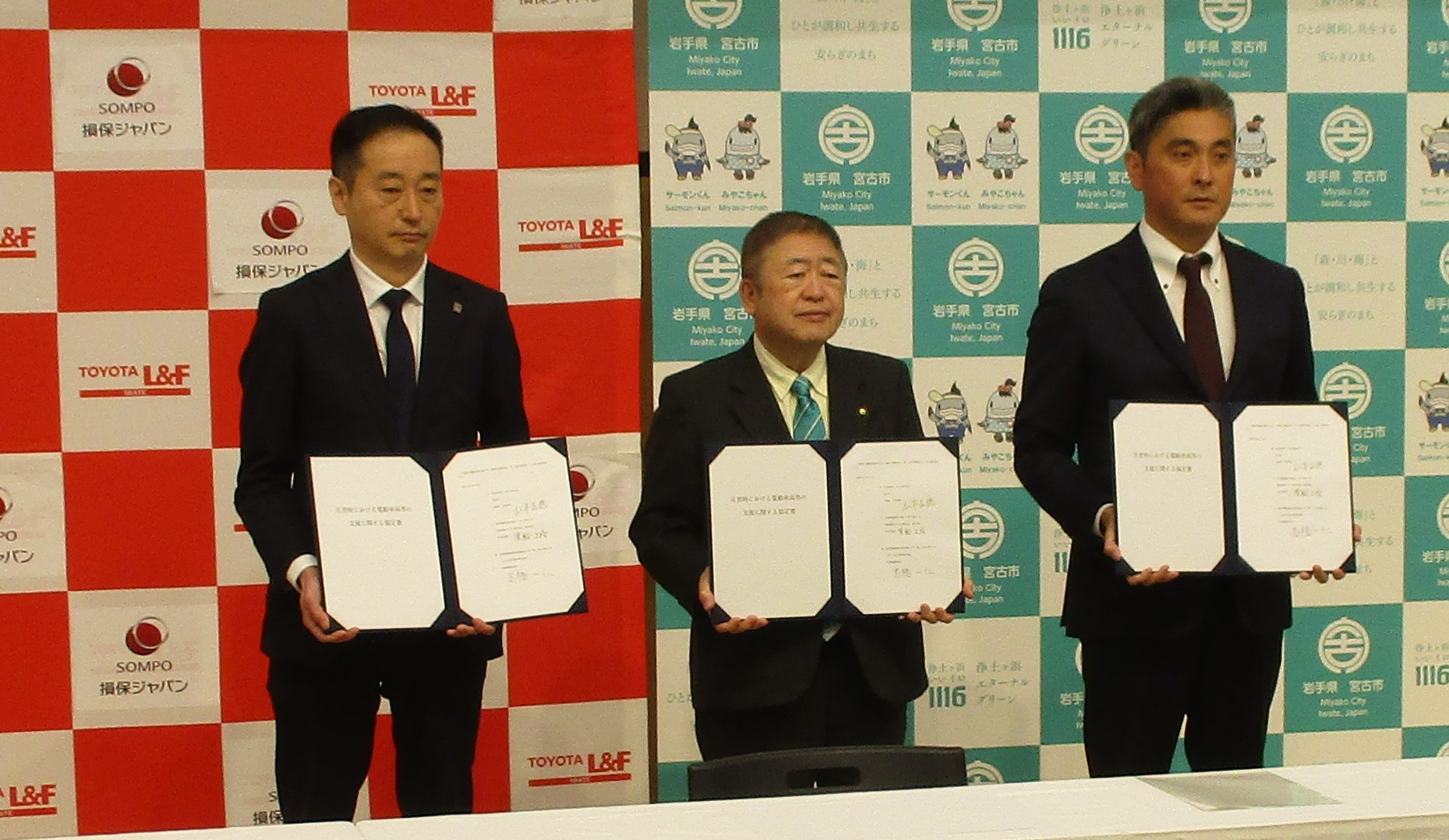 宮古市と損害保険ジャパン株式会社、トヨタL&F岩手株式会社は「災害時における電動車両等の支援に関する協定」を結びました。