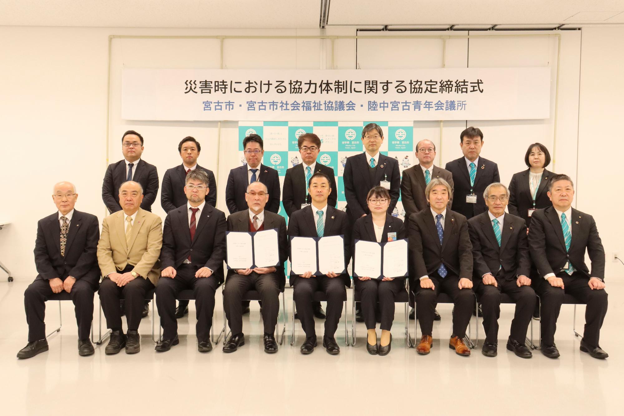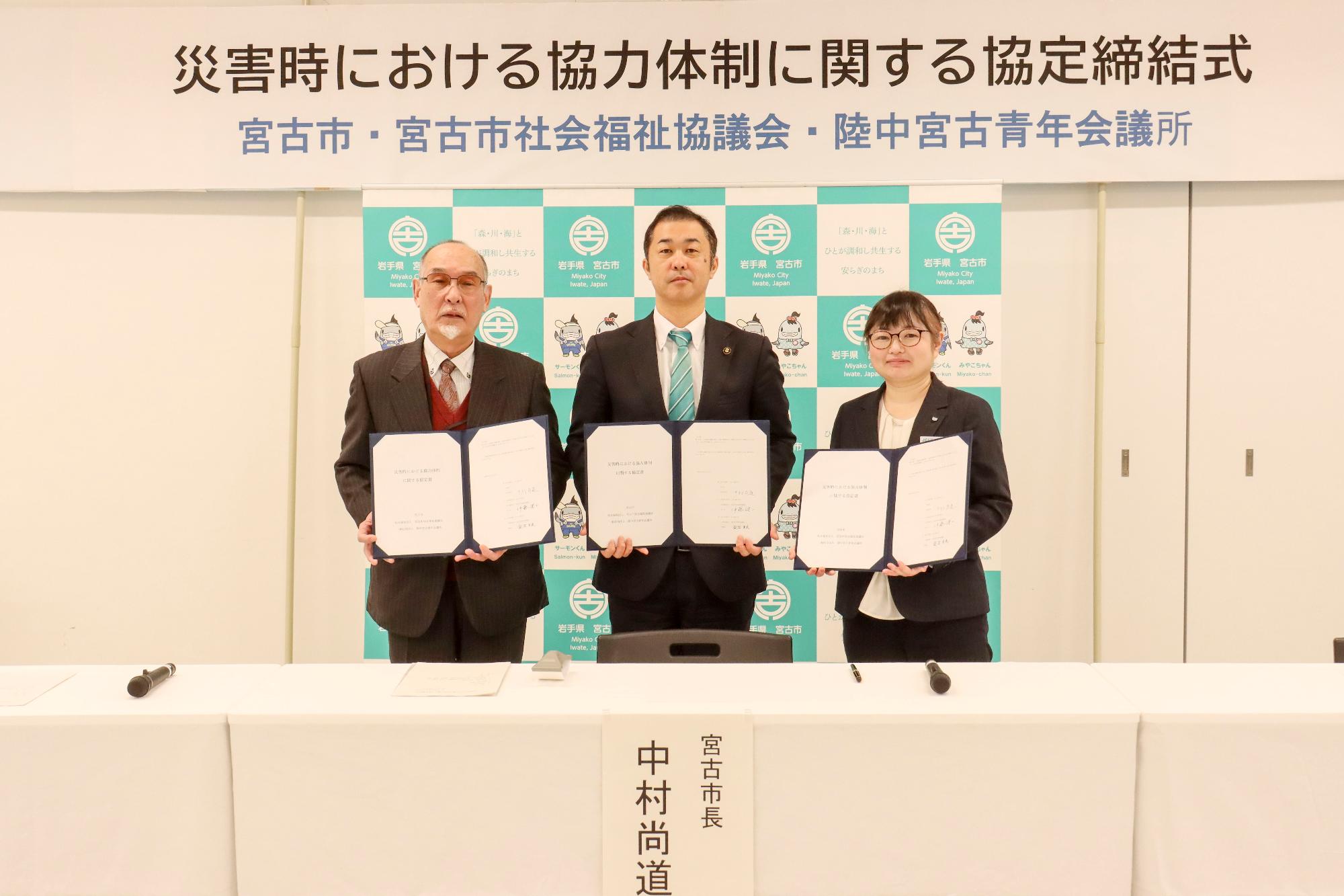 宮古市と社会福祉法人 宮古市社会福祉協議会、一般社団法人 陸中宮古青年会議所は「災害時における協力体制に関する協定」を結びました。