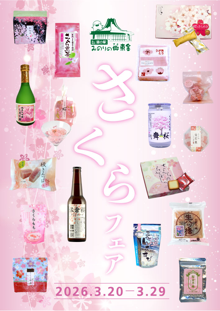 道の駅 みのりの郷 東金 東金マルシェでは、2026年の春のお彼岸の期間中、入口すぐの特設コーナーにて、さくらっぽい商品をズラリと揃えた「さくらフェア」を開催します。