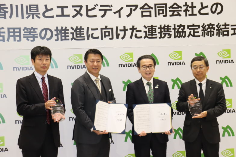 香川県は17日、米半導体大手NVIDIA(エヌビディア)とAI(人工知能)活用に向けた連携協定を結んだ。香川県庁で締結式を開き、池田豊人知事と同社日本法人の大崎真孝代表兼米国本社副社長が協定書に署名した。データセンター「AIファクトリー」の誘致とクラスター形成へ連携していく。同社が日本の地方自治体と協定を結ぶのは今回が初めて。
