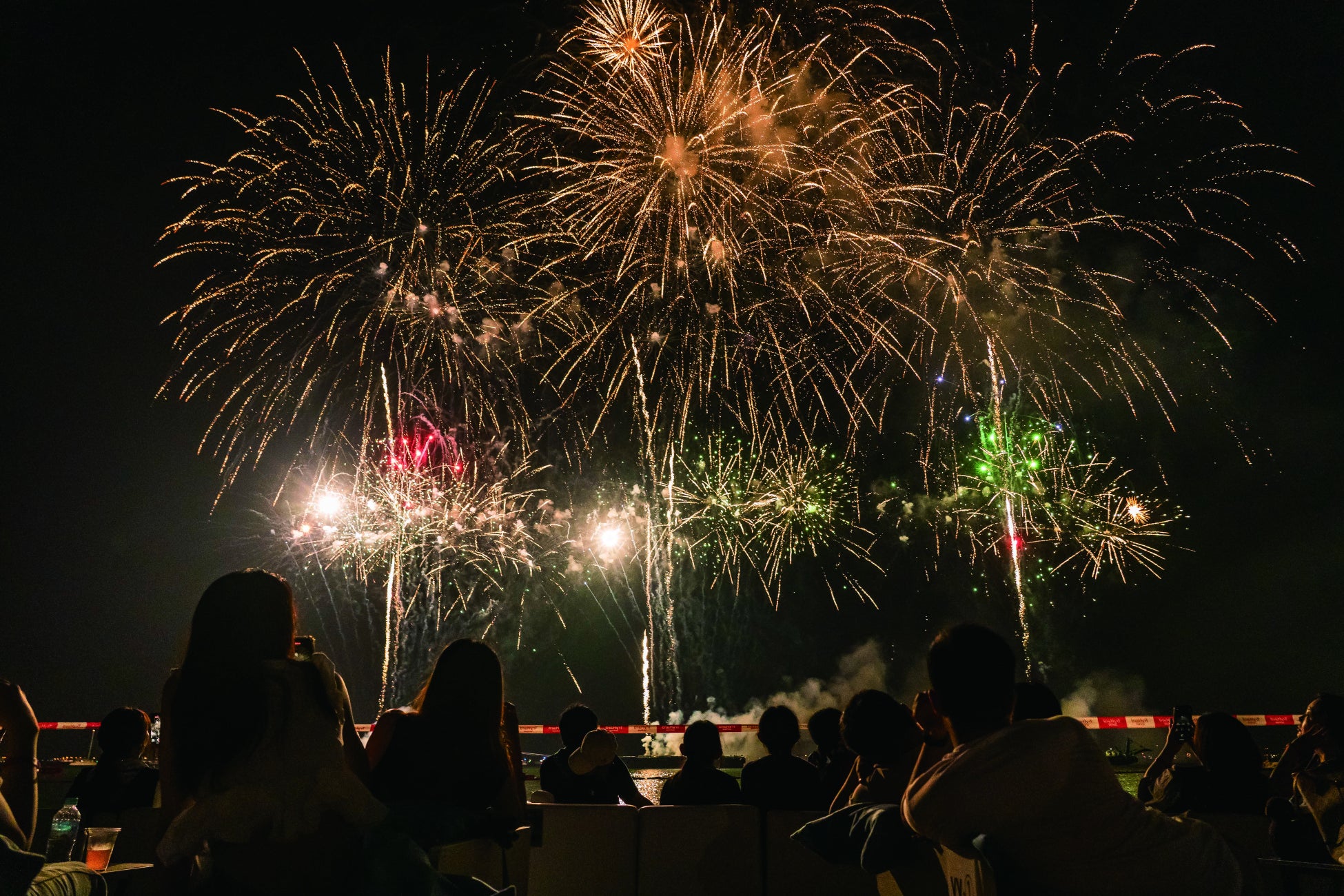 花火が弧を描いて広がる演出の流れを、全体像としてしっかり体感できるパイプ椅子席。演出の全貌を俯瞰しやすく、落ち着いてショーを鑑賞したい方に適した観覧エリアです。