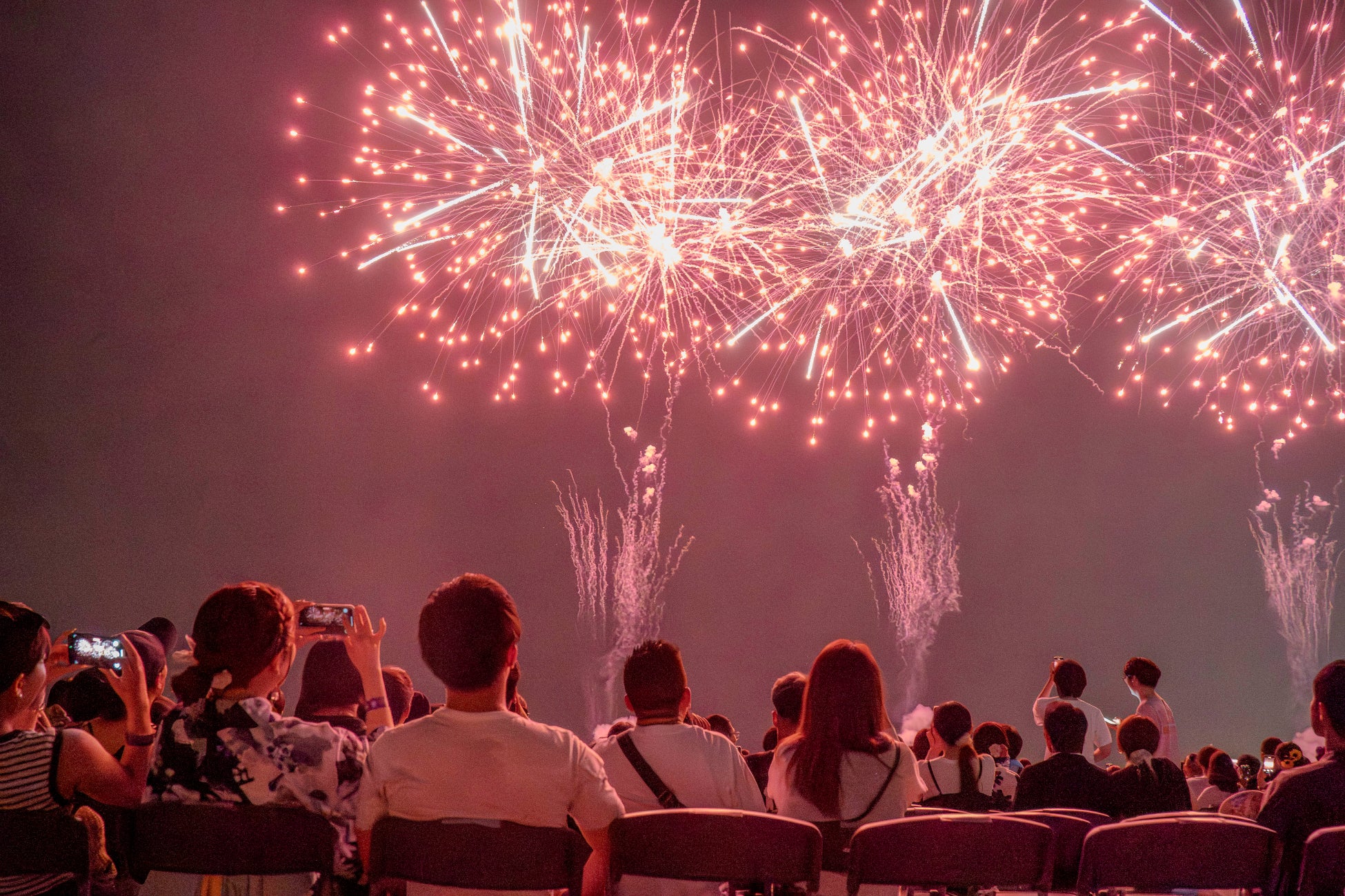 空いっぱいに広がる花火のスケール感と音響の調和をバランスよく楽しめるパイプ椅子席。少し距離を置くことで、花火の広がりをワイドに体感できる視界の開けたエリアです。