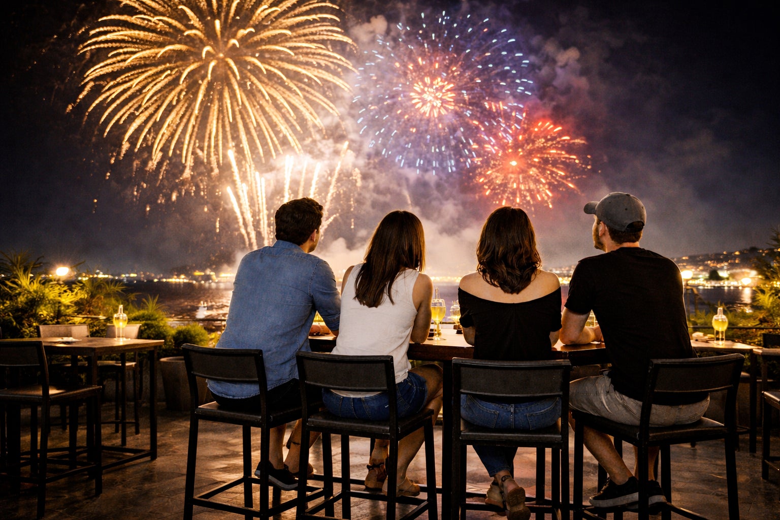 波打ち際の前方に配置された、5名掛けのガーデンテーブル席。潮風を感じながら、ダイナミックな花火と空間演出を落ち着いた環境で堪能いただけます。5名分のドリンクチケット付。