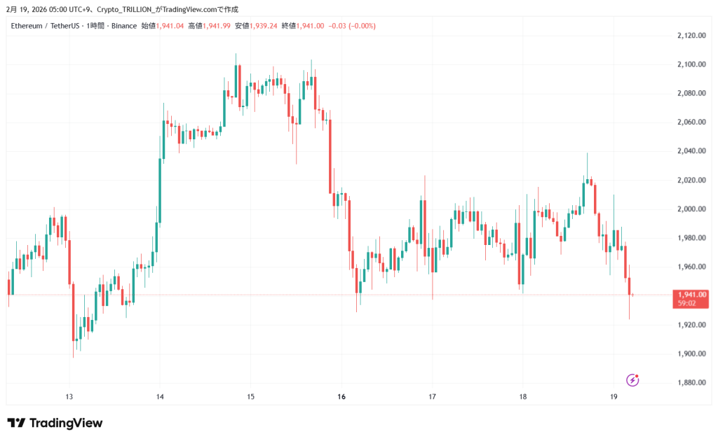 19日5時現在のイーサリアムの価格は1,941.04USDT、前日同時刻比で-2.9%の下落となっている。