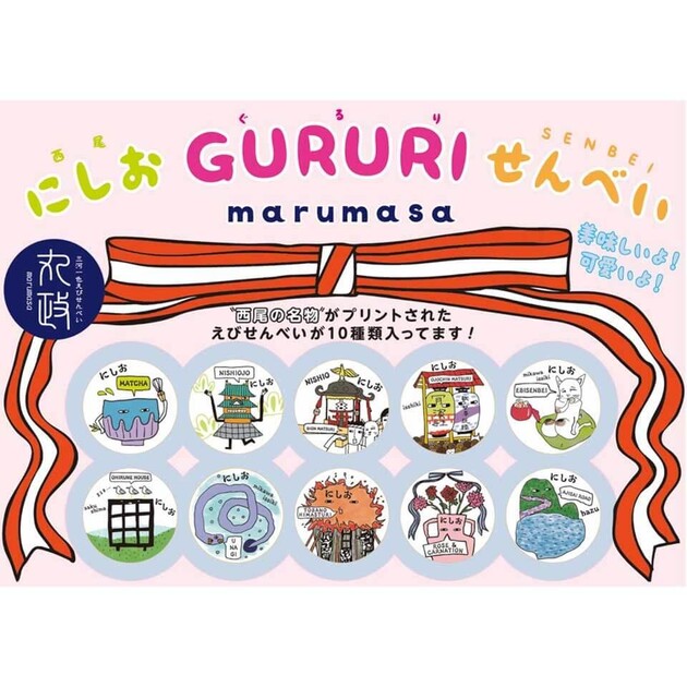 「にしおGURURIせんべい」は、西尾の名物を10種類、食用インクで丁寧にプリントした、見ても食べても楽しいお土産せんべいです。