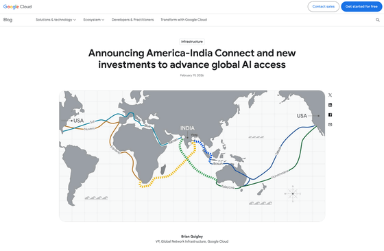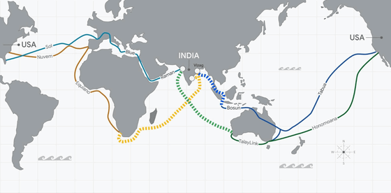 Googleは世界中でおよそ20件の海底ケーブルに投資を行っていますが、新たにアメリカとインドを結ぶルートを増やすべく3本の海底ケーブルを敷設する「America-India Connect」構想に取り組むことを発表しました。