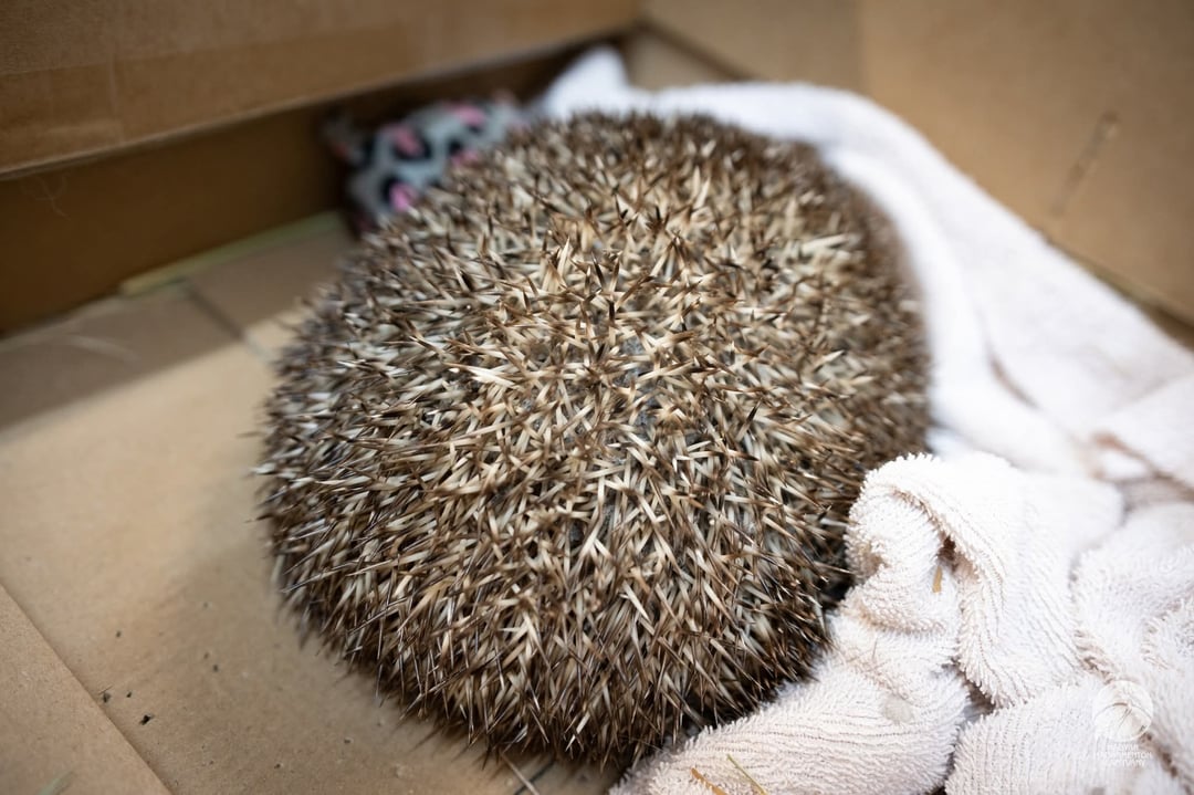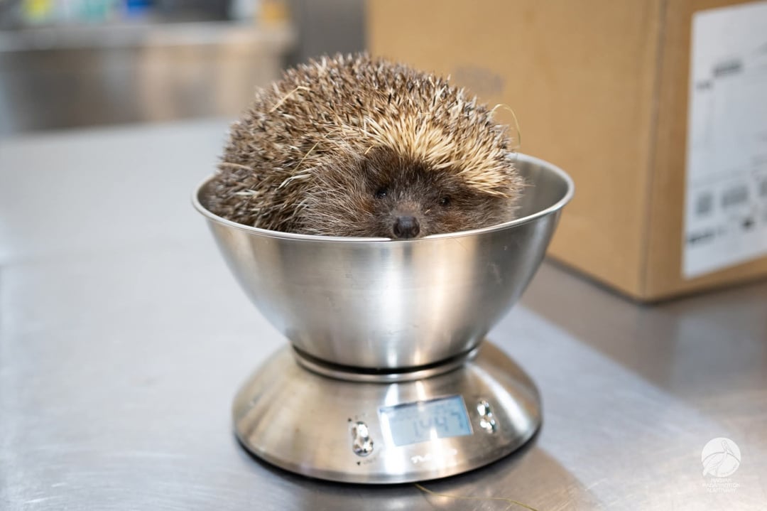 "ブリュンヒルダ (それは私たちの新しい住人の名前です) は現在厳しいダイエット中です。健康なハリネズミが長い旅の間にそのサイズまで縮み、体重超過による他の健康上の問題が発生しなければ、私たちはそのハリネズミを野生に戻します。"