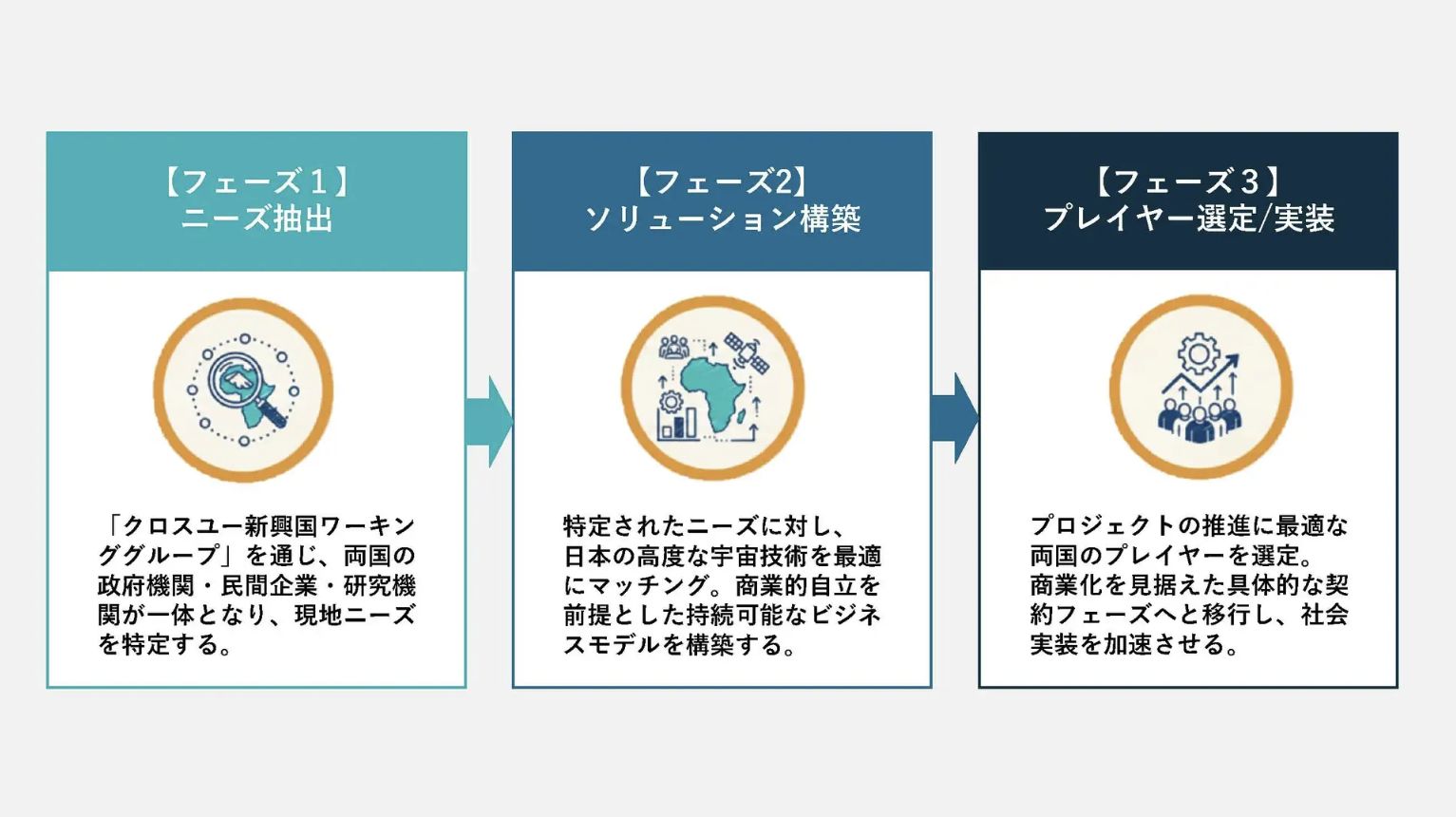コンソーシアムでは、(1)両国の政府機関や民間企業などの連携による「ニーズ創出」、(2)日本の宇宙技術を生かした「ソリューション構築」、(3)プロジェクト推進に最適な両国の「プレイヤー選定と実装」の、3フェーズでアフリカ諸国での具体案件を形成する予定。