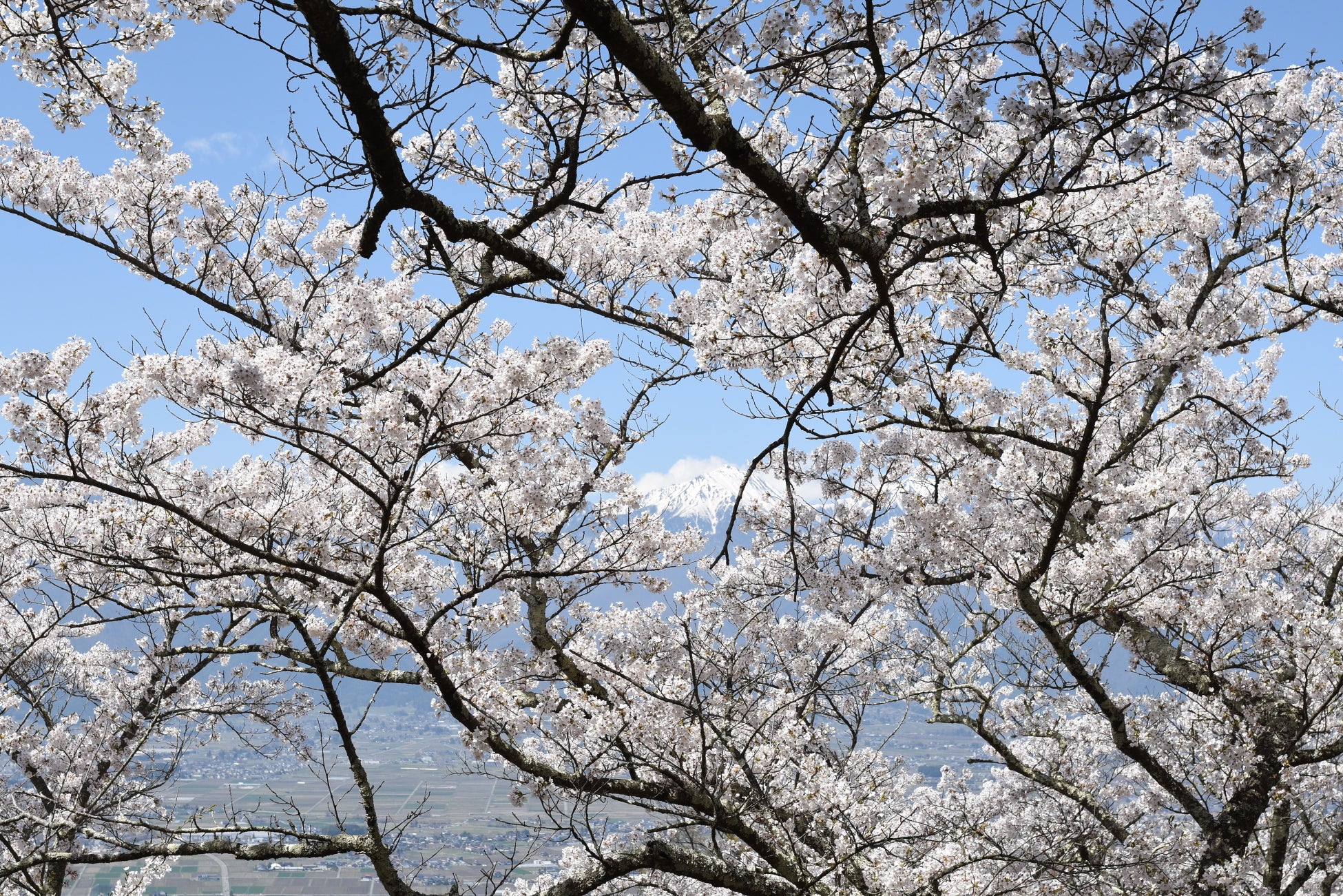 満開の桜と北アルプスが広がる光城山