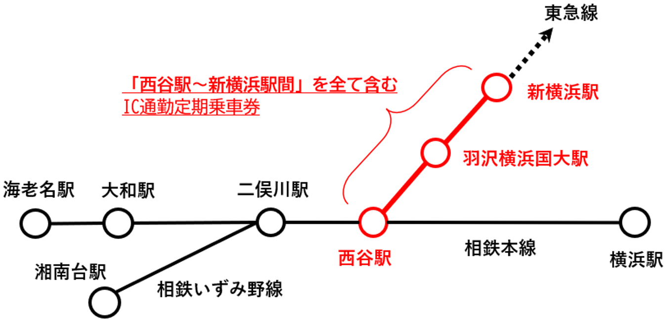 例① 定期区間に「西谷駅~新横浜駅」を全て含む定期券の場合