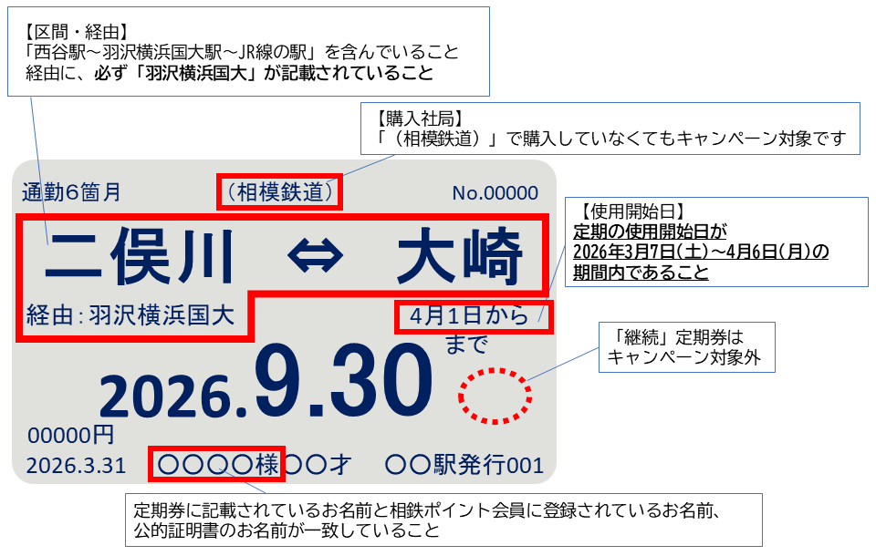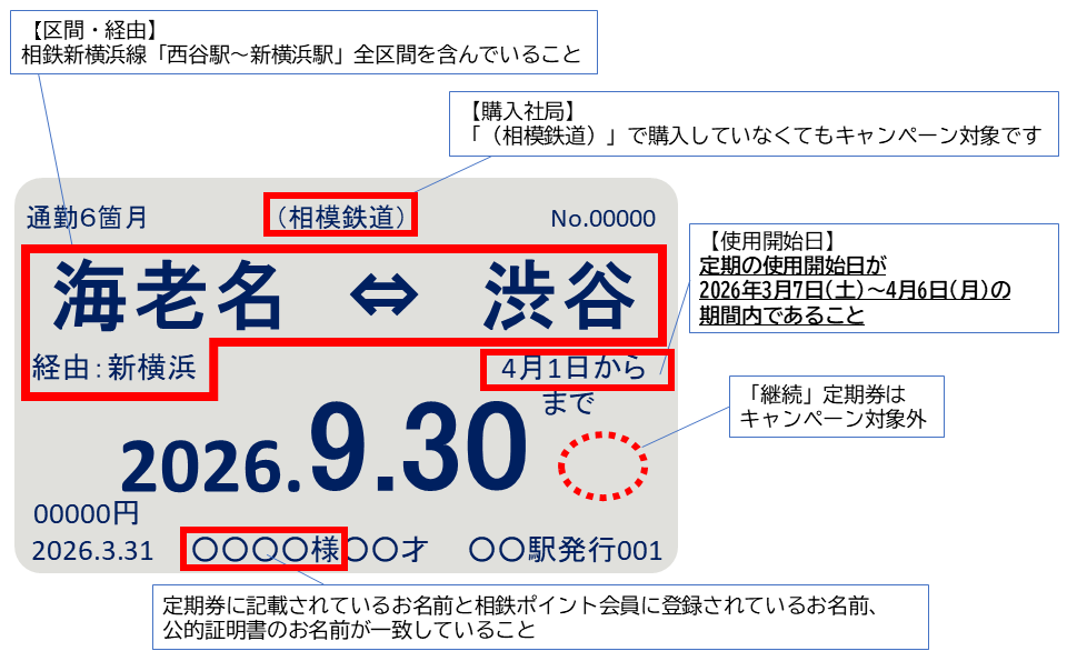 定期区間に「西谷駅~新横浜駅」または「西谷駅~羽沢横浜国大駅~JR線区間」を全て含む定期券の使用開始日が2026年3月7日(土)~4月6日(月)の期間内