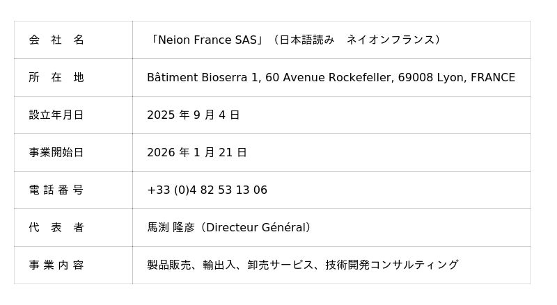 日榮新化株式会社(代表取締役社長:清水 寛三、以下「当社」)は、フランス共和国リヨン市に子会社「Neion France SAS」(日本語読み:ネイオンフランス)を 2025 年 9 月 4 日 設立、2026 年 1 月 21 日 事業開始致しました。