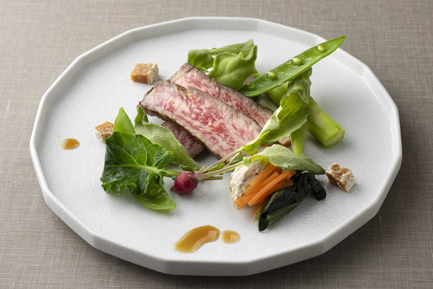 今春は、奈良県が誇る和牛「大和牛」をはじめ、シェフが奈良県の生産者を訪問し、作り手の姿勢に触れて感銘を受け、選び抜いた食材を中心にコース料理を構成いたしました。吉野晒(よしのざらし)の製法を150年以上守り続ける天極堂の吉野本葛のほか、江戸時代から天日干しの製法を受け継ぐ嘉兵衛本舗の番茶、奈良県産大豆にこだわり、在来種の豆「大鉄砲大豆」を復刻して作った豆腐や醤油、奈良県の柿を多様な加工品に仕立てる「柿の専門」の柿酢など、生産者の思いが伝わる食材を取り入れております。