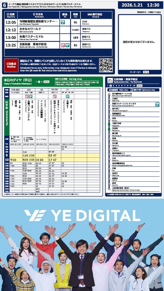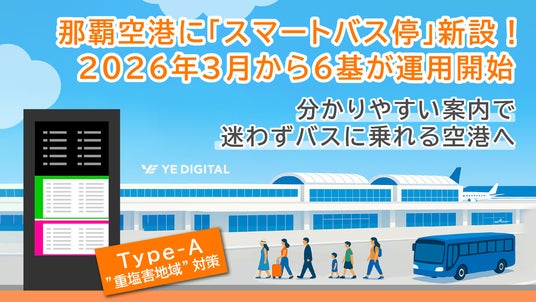 株式会社YE DIGITAL(※1、以下 YEデジタル)が提供し、NECネクサソリューションズ株式会社(※2、以下 NECネクサソリューションズ)が販売する「スマートバス停」が、この度、那覇空港ビルディング株式会社(※3、以下 NABCO)により導入され、2026年3月1日(日)より那覇空港旅客ターミナルビル1階バス乗り場1番~6番にて運用を開始します。