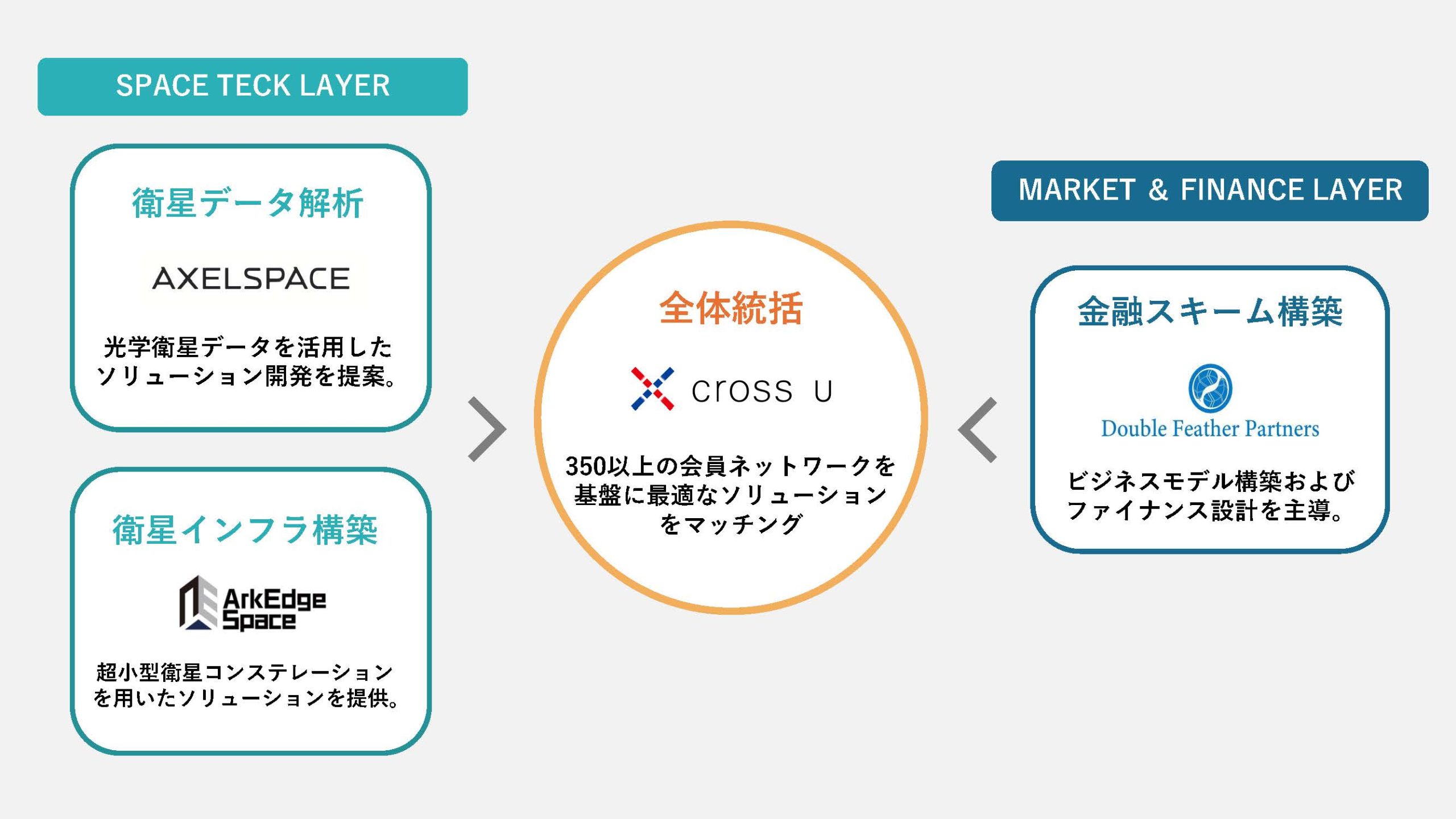 日本の各分野のトップランナーが連携し、プラットフォーム機能・衛星データ解析・衛星インフラ構築・金融スキーム構築を有機的に統合します。今後、本コンソーシアムのメンバーを拡大し、より広い分野において案件が形成できるよう体制を強化してまいります。