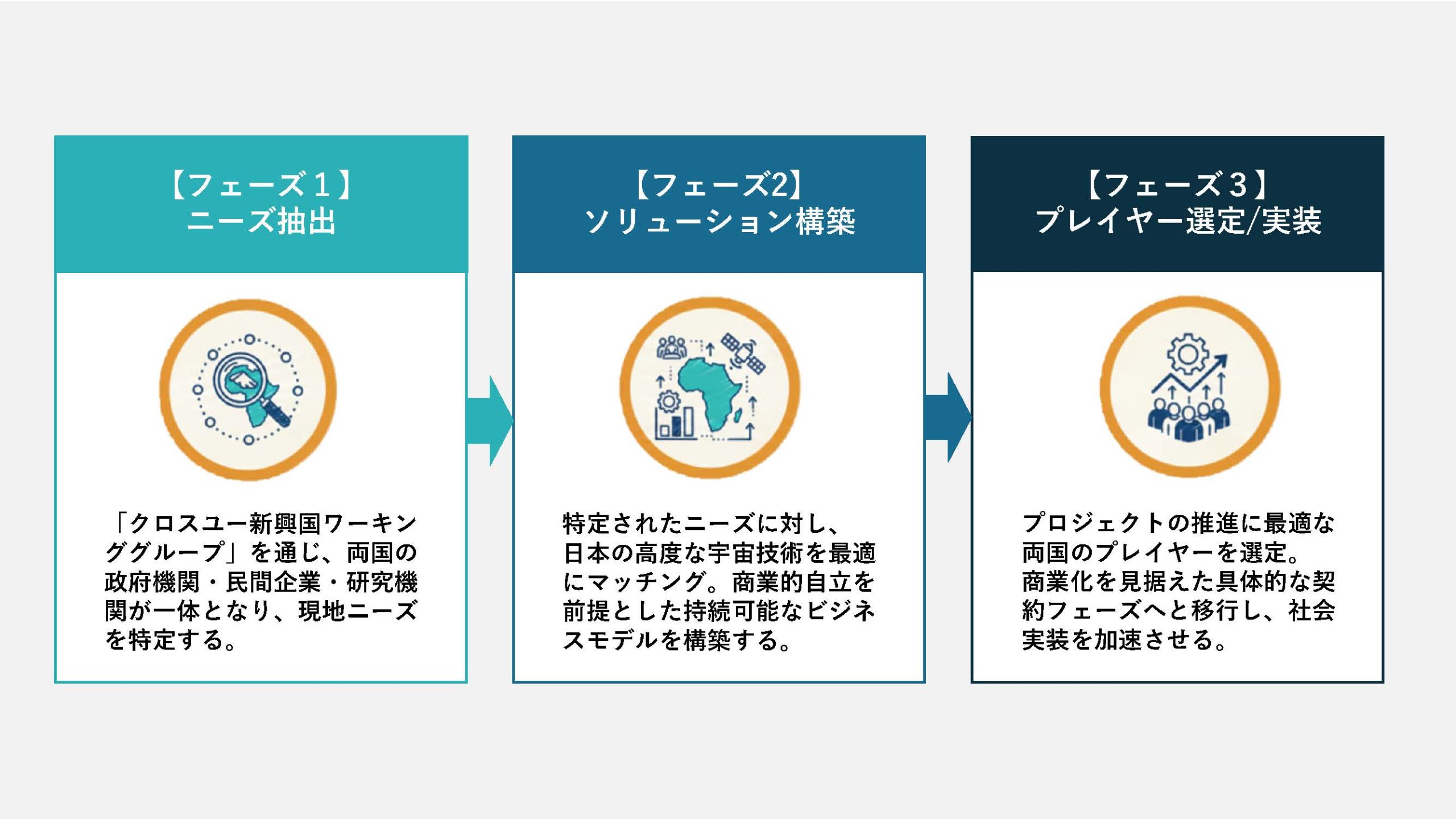 本コンソーシアムでは、以下の3フェーズでアフリカ諸国での具体案件を形成していきます。