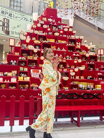 赤いひな壇やつるし飾りを背景に写真を撮れば、春らしい一枚が残せる。友人同士で色違いの着物を選ぶのも楽しく、特別な思い出づくりにぴったりだ。