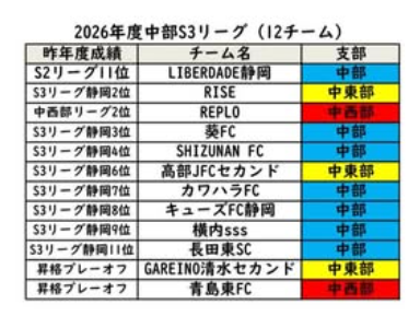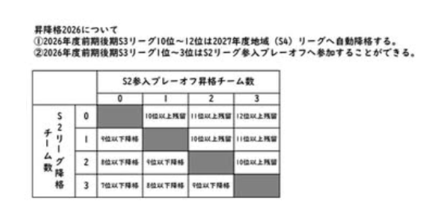 ①2026年度前期後期S3リーグ10位~12位は2027年度地域(S4)リーグへ自動降格する。