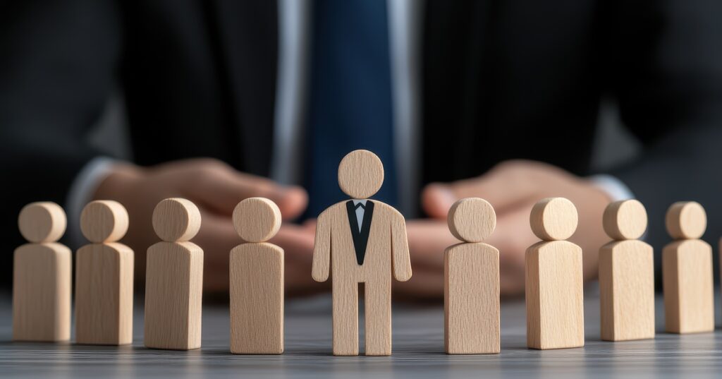 A leader figure stands confidently among smaller figures, symbolizing guidance, authority, and teamwork in a corporate setting.