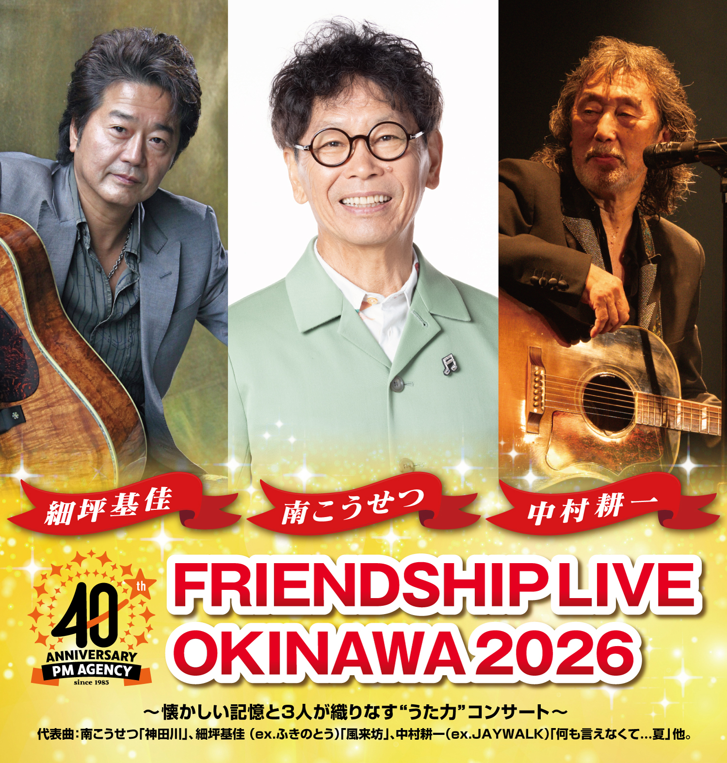 比嘉:ピーエムの40年間の中で、まずは一番お付き合いの長い南こうせつさんとスタ☆レビに声をかけました。4月26日(日)に沖縄コンベンションセンター 劇場棟で『FRIENDSHIP LIVE OKINAWA 2026』と題して、こうせつさん、元ふきのとうの細坪基佳さん、元JAYWALKの中村耕一さん3組によるコンサートが決定しています。そして、スタ☆レビとも沖縄ならではの面白いことをやろうと考案中です。スタ☆レビは沖縄で一番多くライブをしていますからね(笑)。