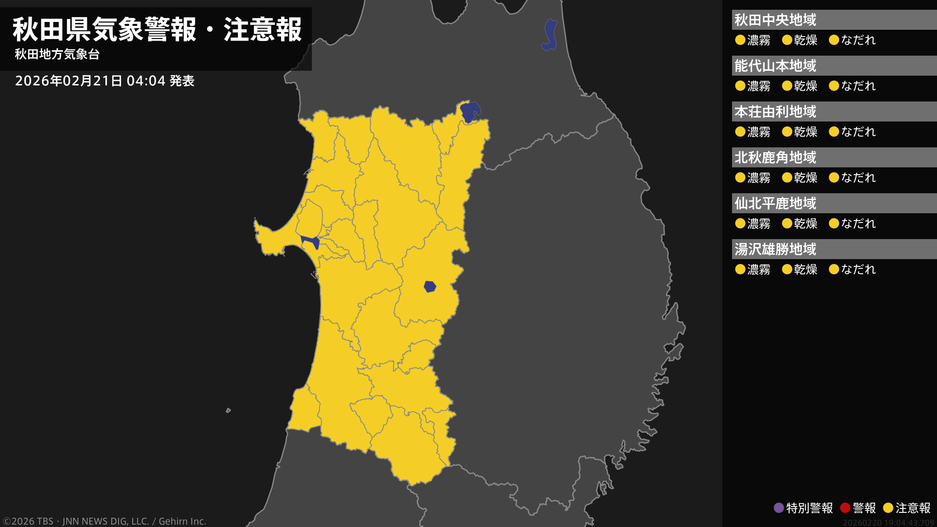 【なだれ注意報】秋田県・秋田市、能代市、横手市、大館市、男鹿市、湯沢市などに発表(雪崩注意報) 21日04:04時点