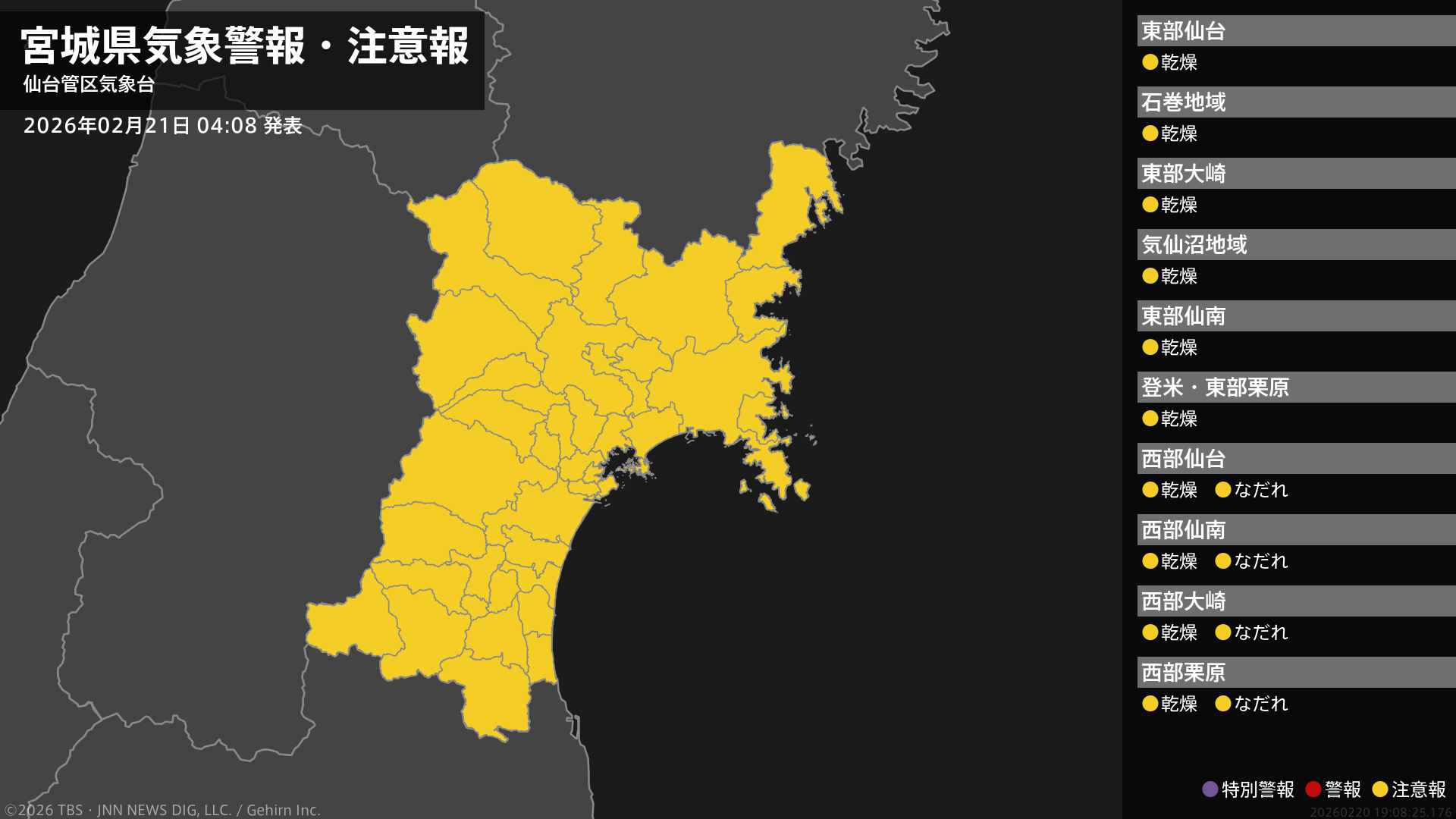 気象台は、午前4時8分に、なだれ注意報を仙台市西部、白石市、栗原市西部、大崎市西部、蔵王町、七ヶ宿町、川崎町、大和町西部、色麻町、加美町に発表しました。