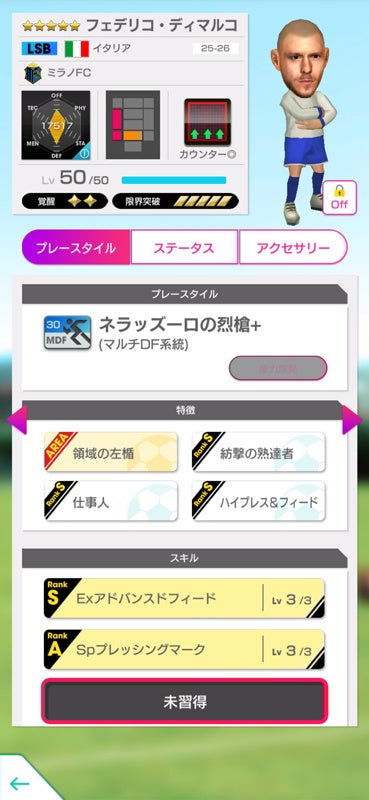今回登場する「ファビオ・カンナバーロ」が限界突破で獲得できるスキル、「栄冠のカピターノ+」はSSランクスキルです。自身が所持するSランク以下のスキルと同時に発動条件を満たした場合、それらのスキルよりも優先的に発動します。