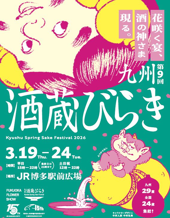 JR博多シティ開業15周年を記念し、九州や全国の選りすぐりの蔵元が集う恒例イベント「九州酒蔵びらき2026」が、3月19日(木)〜24日(火)の6日間、JR博多駅前広場で開催されます。第9回目となる今回は、過去最長の開催期間かつ過去最高の延べ酒蔵数で実施。春の博多を、日本酒とグルメ、そして花で華やかに彩ります。