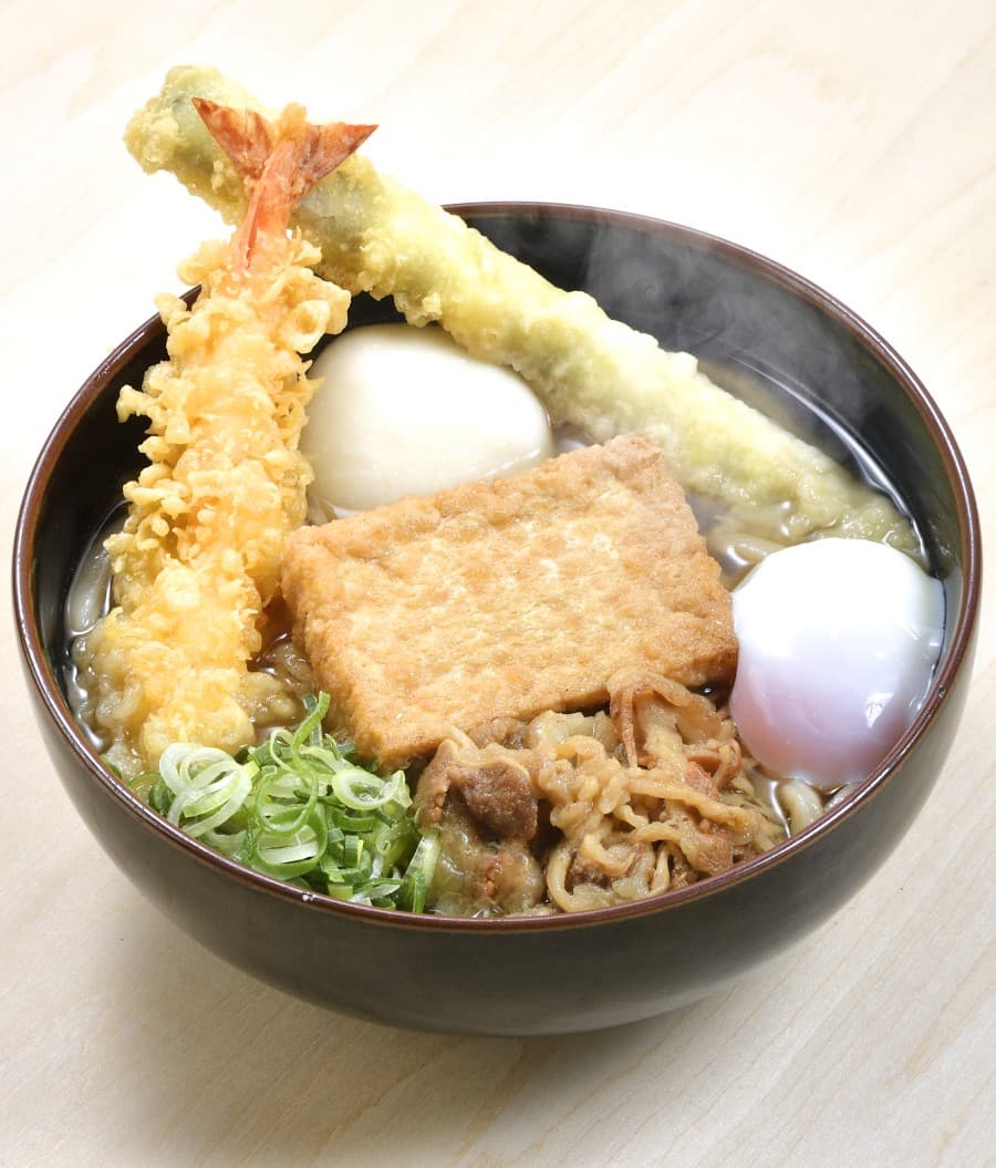 出汁と福岡県産小麦の麺にこだわったうどん店。直売所限定の「もちだんご村特製うどん」は、つきたて餅や海老天、肉など具材がたっぷり入った贅沢なメニューです。